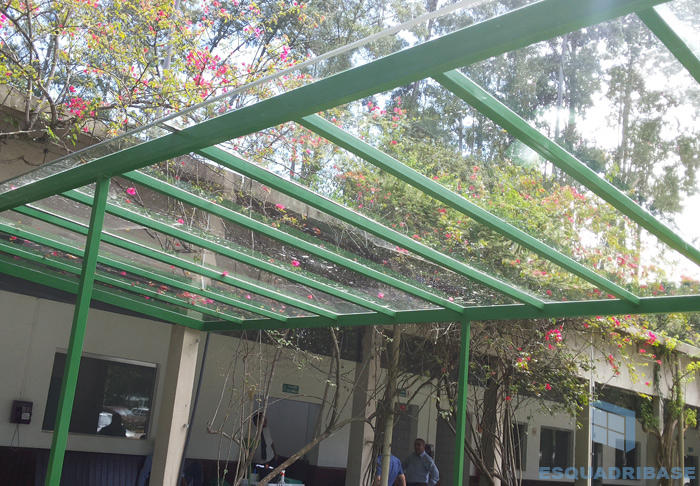 Coberturas fixas nas opções: vidro laminado, comum e especial (com proteção solar) e policarbonato compacto liso. Consulte tabela de cores. Estruturas em ferro e alumínio